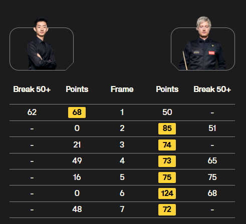 同时段,庞俊旭挑战马克·威廉姆斯。前四局,老马轰出一杆破百,庞俊旭打出一杆50+,庞俊旭3-1领先,但庞俊旭的进球成功率远低于老马,只有79%。