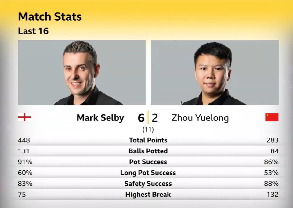 短休后,第5局,双方陷入漫长鏖战,周跃龙被超分后逆转未果。随后,塞大师连续单杆制胜,打出两杆70+,5-2到赛点。第8局,塞尔比二次上手,单杆56分锁定胜利,一波5连鞭,6-2获胜。