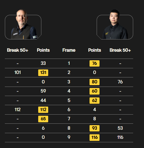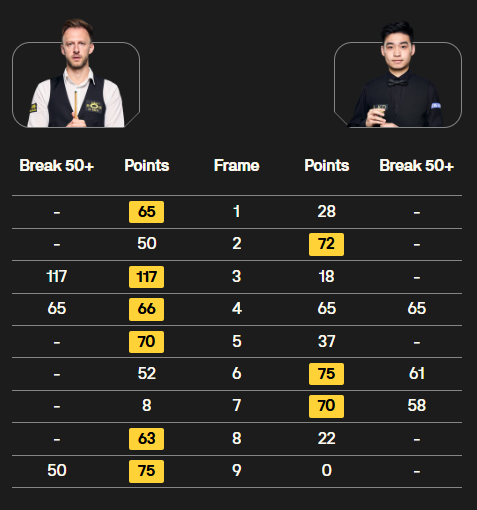 凌晨时段。斯佳辉挑战世界第一的特鲁姆普。双方各赢一局后,第3局,小特破百,第4局,斯佳辉单杆65分被小特一杆65分清台、1分逆转。这局丢得痛。