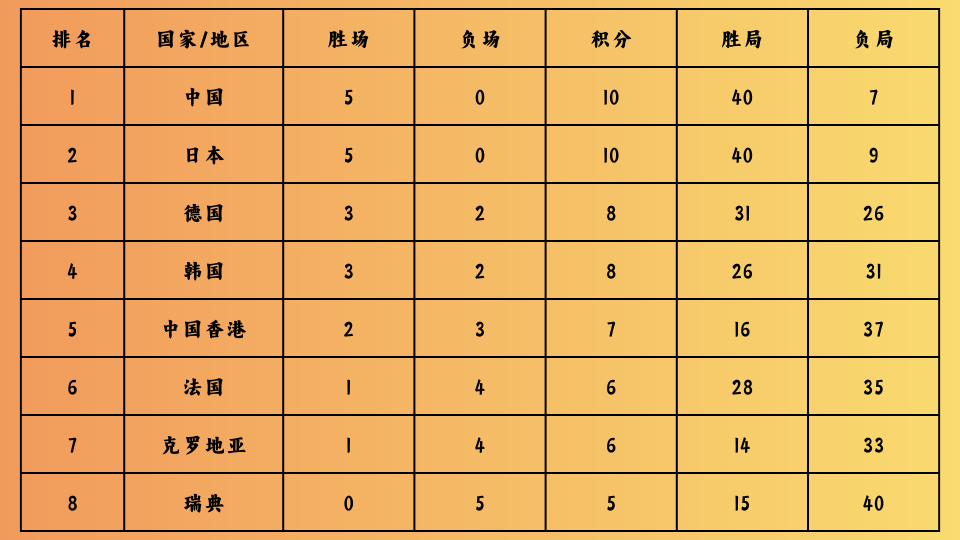 此外,法国队目前只有1胜,对阵德国、韩国和中国香港的比赛全部失利,已经提前出局了。克罗地亚、瑞典皆战绩不佳,同样提前退出四强席位争夺。