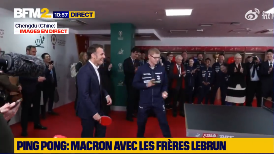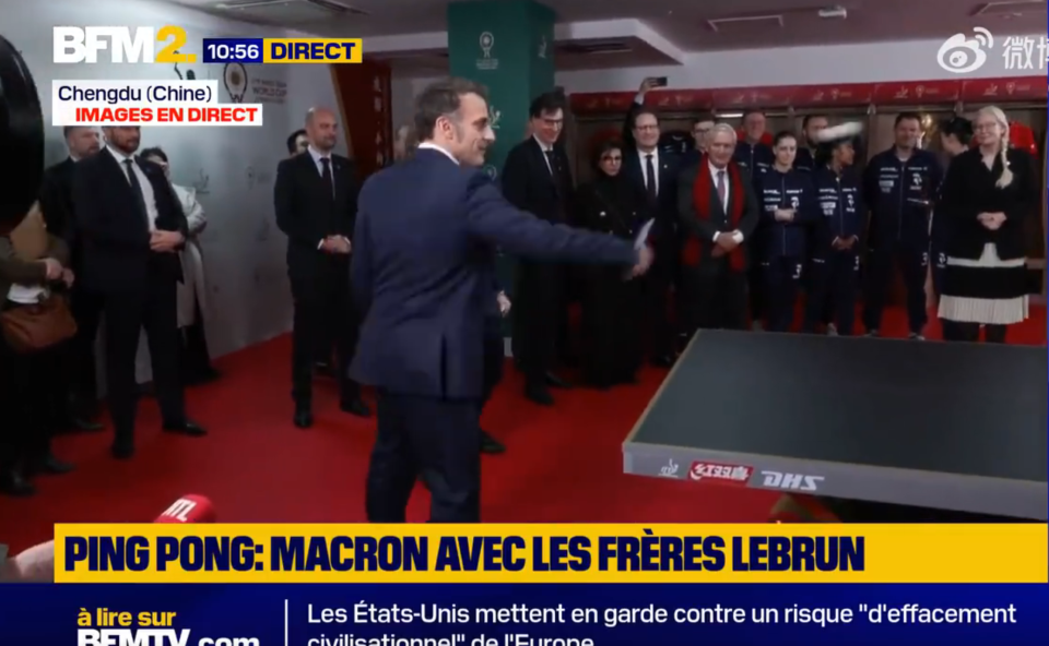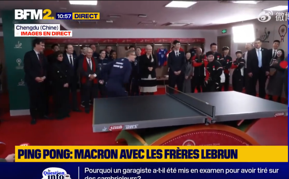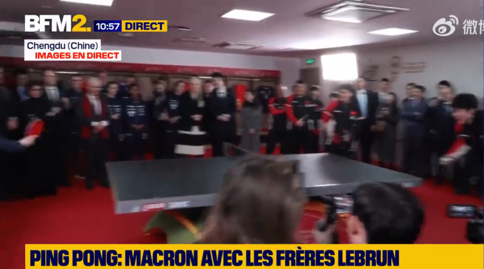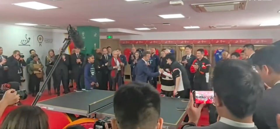 在法国队西蒙·高茨、普里提卡·帕瓦德、夏洛特·卢茨、袁嘉楠及教练团队、中国队成员注视下,马克龙还和小勒布伦搭档,与王楚钦、林诗栋进行了一场友谊赛。