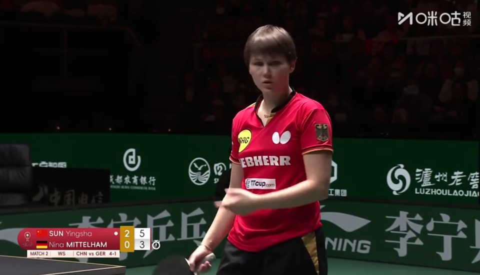 孙颖莎与米特兰姆的比赛打到第三局,孙颖莎4-3领先,孙颖莎发球,米特兰姆回球出界,比分5-3,随即米特兰姆提出孙颖莎发球擦网,