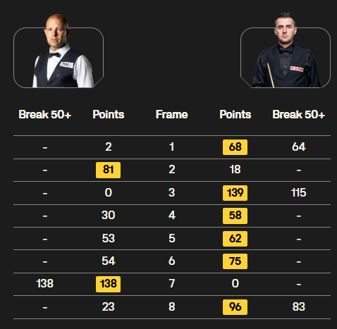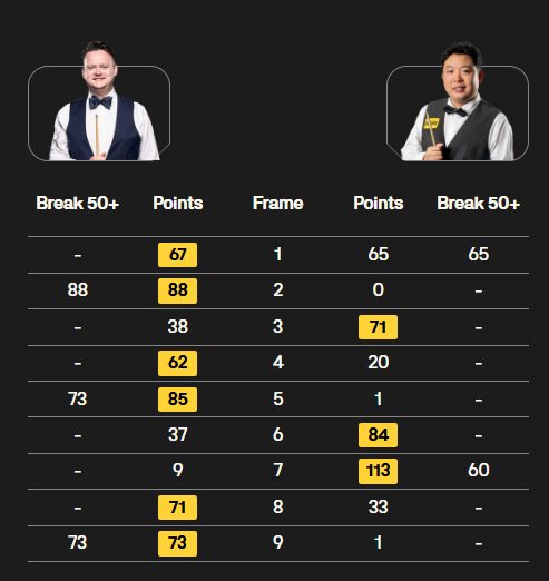 同时段,庞俊旭挑战火炮罗伯逊。庞俊旭先赢一局后,连丢5局,其中第4局,庞俊旭打丢黄球,失制胜机会。
