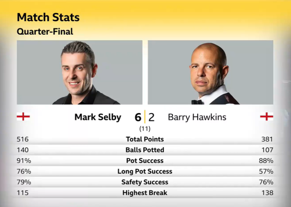 另一场比赛,塞尔比对阵霍金斯。塞尔比打出一杆破百、2-1后,双方陷入鏖战。塞尔比5-1到赛点。第7局,霍师傅一杆破百清台。第8局,霍金斯打丢机会,塞大师一杆83分、6-2终结比赛。