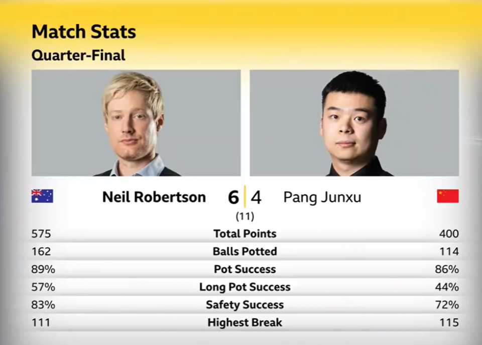 第10局,庞俊旭安全球失误,罗伯逊一杆75分制胜,6-4结束比赛。