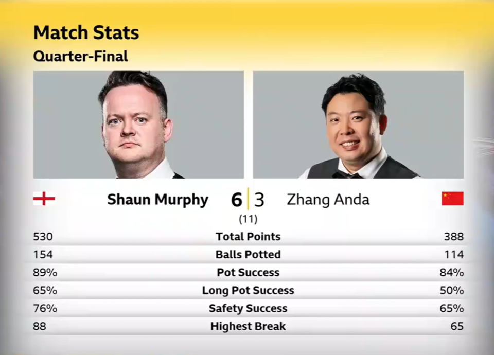 第9局,张安达长台准进,但随即彩球失误。墨菲接手一杆73分,6-3终结比赛。