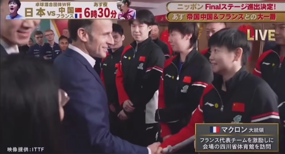 12月5日,正在中国访问的法国总统马克龙来到了四川省体育馆看望法国队队员们,他也顺带着接见了中国乒乓球队的全体队员、教练。