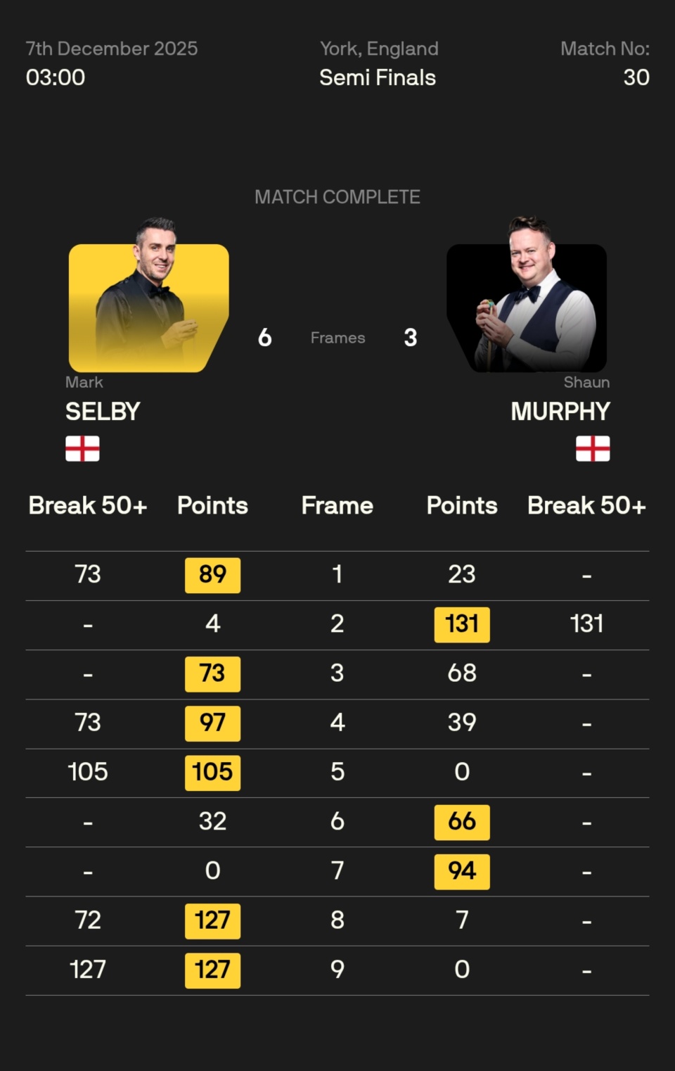 局休回来,塞尔比再胜一局,墨菲奋力扳回两城,马克·塞尔比凭借单杆致胜,回敬一波两连击,锁定胜利,以6-3力压肖恩·墨菲,晋级决赛。