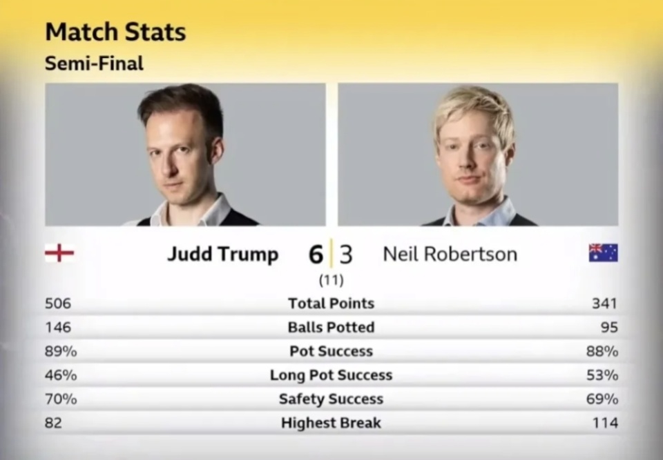 第五局耗时近50分钟的防守大战,两人战至最后一颗黑球,罗伯逊翻袋攻进黑球,3-2领先特鲁姆普,接着特鲁姆普单杆致胜,连胜四局,特鲁姆普在2-3落后罗伯逊的情况下,完成逆转,以6-3战胜罗伯逊,背靠背连续两年晋级决赛,力争卫冕。