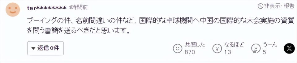 在混团决赛结束后,日本球迷引发了热议,有日本球迷写道:我认为国际大赛上念错名字、巨大嘘声都应该写信询问国际乒联,成都是否有继续举办国际大赛的资格。