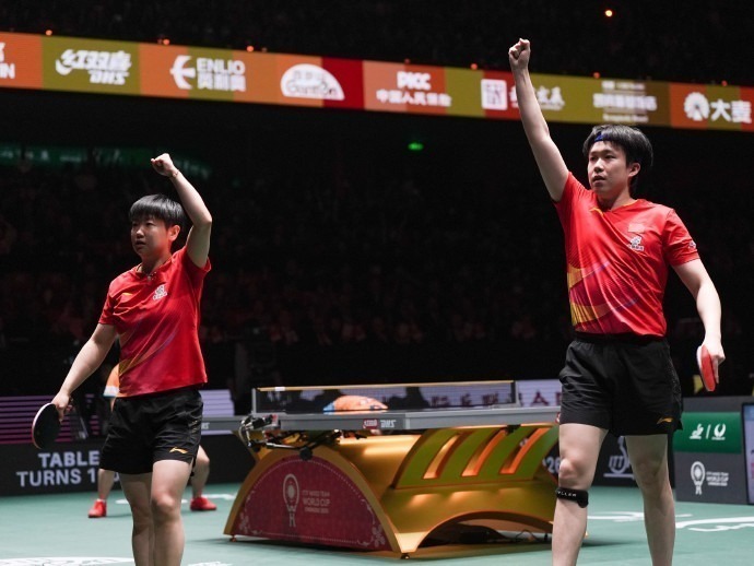 第一场混双比赛,王楚钦/孙颖莎3-0战胜松岛辉空/大藤沙月,三局比分为:11-4、11-4、11-6。中国队大比分3-0领先。
