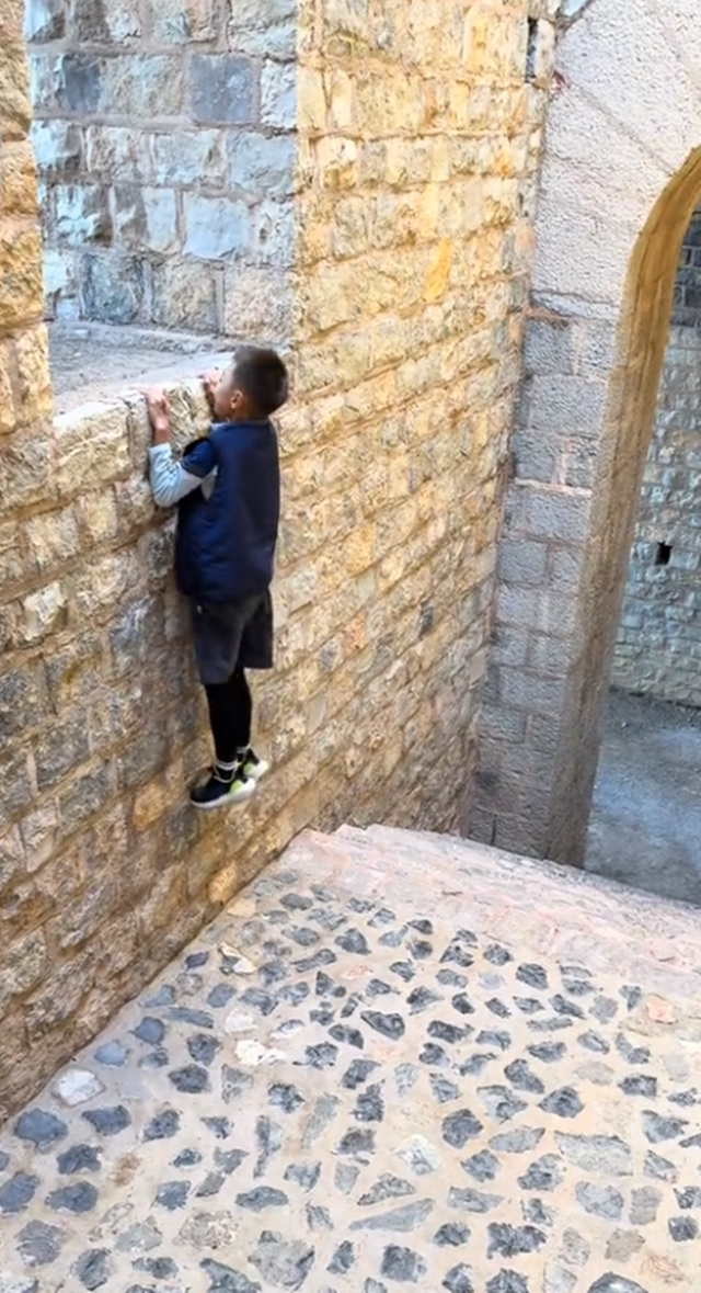 视频中谢杏芳还晒出了小羽撑手跳画面,只见他很轻松的就扒在了高高的石头墙上向外望,别看小羽细胳膊细腿,但打了多年网球的他臂力是真不错。