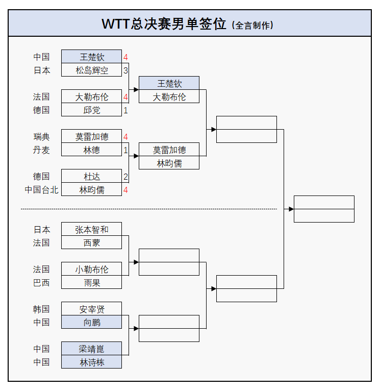 男单:林昀儒(中国台北)4-2杜达(德国)、大勒布伦(法国)4-1邱党(德国)、莫雷加德(瑞典)4-1林德(丹麦);