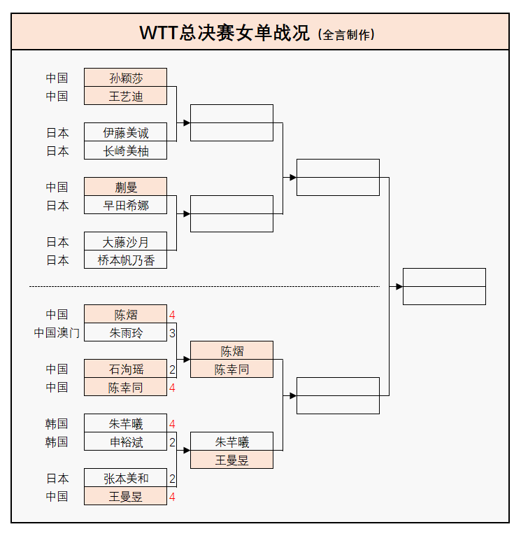 女单:王曼昱4-2张本美和(日本)、陈熠4-3朱雨玲(中国澳门),陈幸同4-2石洵瑶;