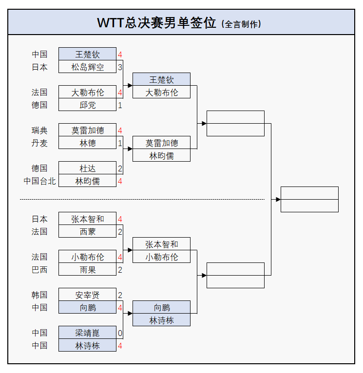 1/4区:王楚钦(中国)4-3松岛辉空(日本)、大勒布伦(法国)4-1邱党(德国);