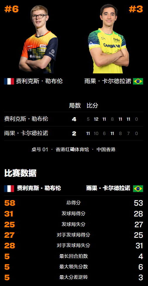 北京时间2025年12月11日晚,乒乓球WTT香港总决赛男单首轮的最后一战落下帷幕,巴西名将雨果在与法国选手小勒布伦的较量中2-4被逆转,由此而成为梁靖崑之后第二位在该项目中被淘汰的世界冠军:至此,男单8强全部出炉,国乒3人晋级1人输队友,日本、瑞典、中国台北各1人过关,法国勒布伦兄弟2人双双获胜——雨果VS小勒布伦战况与其他男单首轮比赛详情请看下文。
