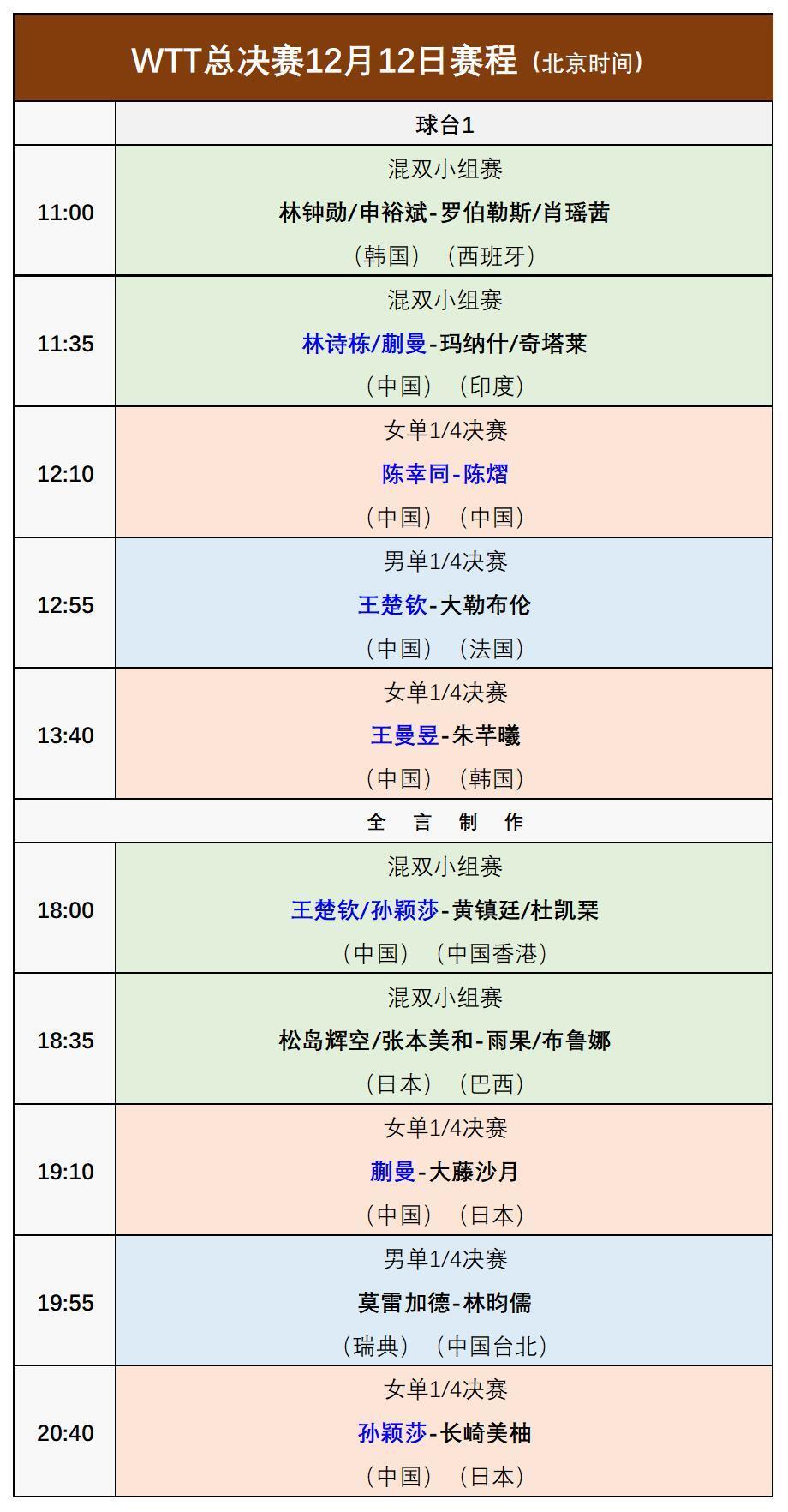 乒乓总决赛12月12日赛程:中日再战2场!王楚钦阻击大勒布伦