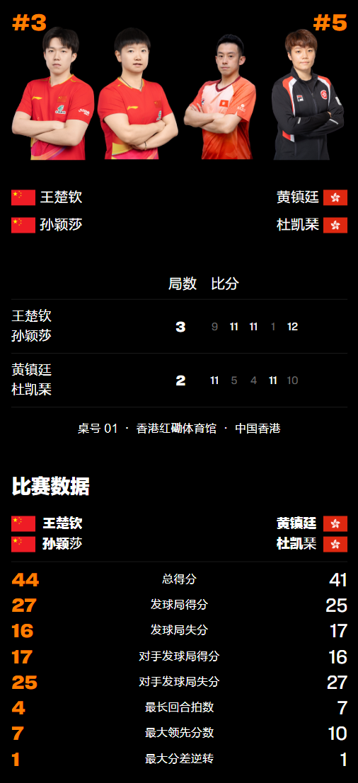 第三局中国香港组合上来就连丢4分陷入被动,但王楚钦/孙颖莎在领先的情况下被对手连续突破防线追至4-3只差1分,不过二人很快便站稳脚跟以极高质量的进攻压制黄镇廷/杜凯琹并以10-4拿到局点,再得1分后以11-4取胜,距离晋级仅一步之遥。