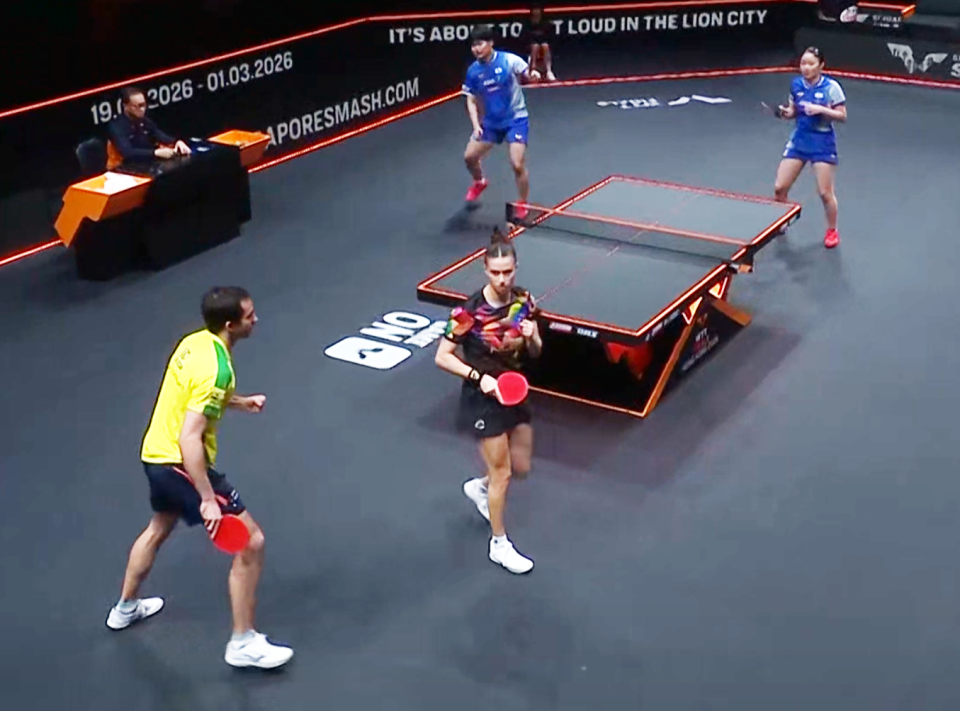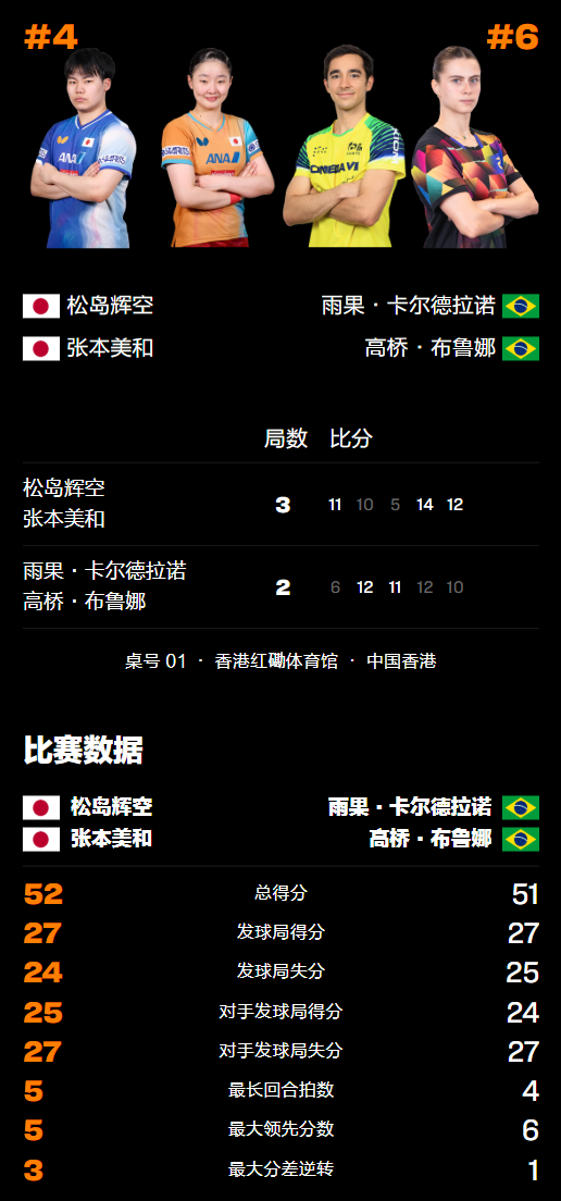 比赛开始后雨果/布鲁娜开局不利落后于人,松岛辉空/张本美和很快便以快打慢得手,在近台成功压制对方,随即以9-5、10-6领先拿到局点,紧接着擦网出现机会球后布鲁娜进攻失误丢分,最终日本组合以11-6成功拔得头筹。