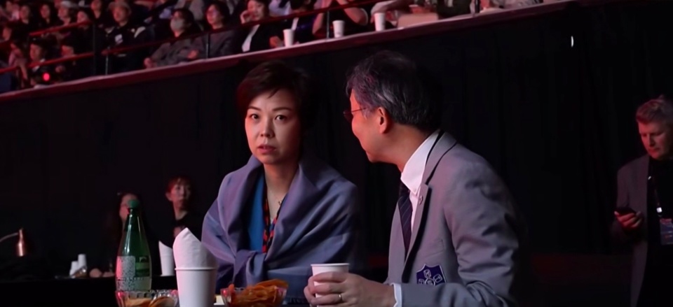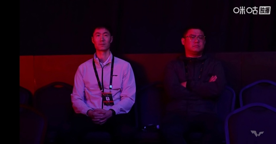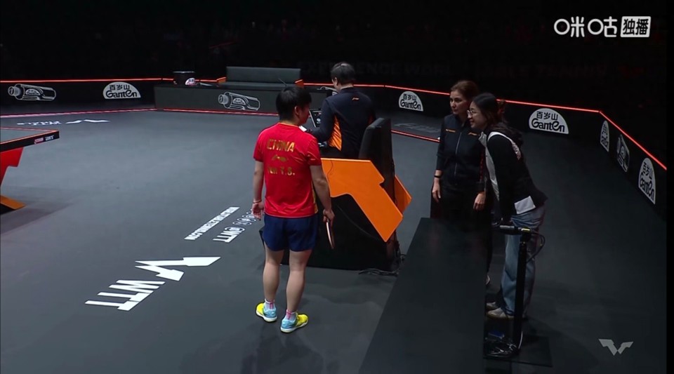 而同样坐在观众席的昔日魔王张怡宁,则是低声与旁边的友人说话,疑似在解释这种突发情况。