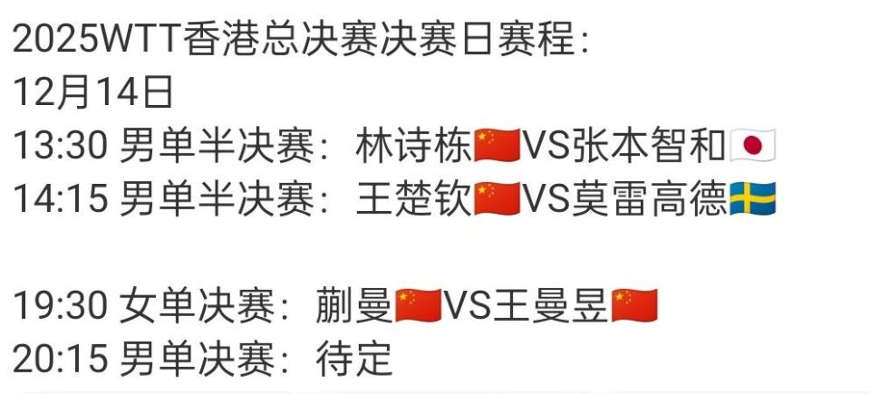 按照最后赛程,12月14日产生两项单打冠军,男单半决赛王楚钦vs莫雷加德(瑞典)、林诗栋vs张本智和(日本),王楚钦就是奥运会输过莫雷加德一次,后续双方经常交手,莫雷加德也没赢过,所以说王楚钦还是有很大的把握,只要发挥正常水平就好,莫雷加德应该拦不住这次的王楚钦。