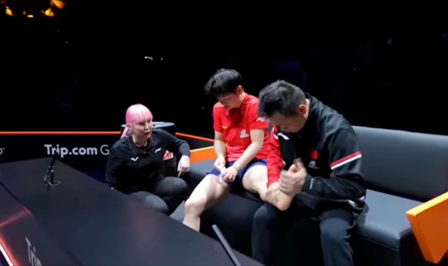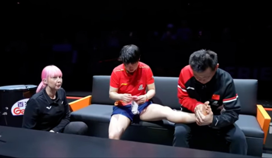 6个小时内,孙颖莎打了三场比赛。在下午场打了混双半决赛,晚间七点半她参加了女单第一场半决赛,比赛途中发生了左脚脚踝受伤,随队医生进场进行了紧急处置后,她和蒯曼的半决赛又继续进行,还是感觉不适不得不宣布退赛,这也是孙颖莎职业生涯首次在比赛中退赛。间隔一个多小时后,孙颖莎带伤又参加混双决赛。比赛中看出她行动迟缓,脚步移动不再那么灵活,很快的0-3输掉决赛,这也是孙颖莎/王楚钦混双组合在决赛中第一次输掉决赛。