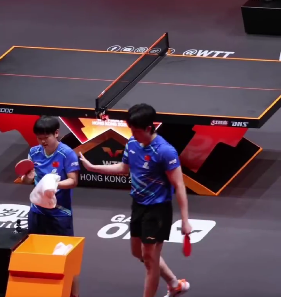 王楚钦看到孙颖莎有点伤心,赶紧过来拍了拍孙颖莎的肩膀,表示安慰。
