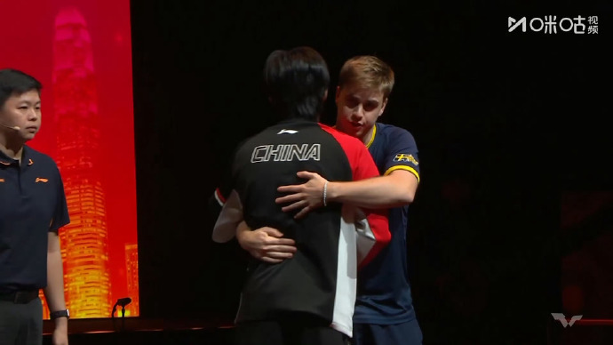 14日下午,WTT香港总决赛男单半决赛,王楚钦因伤退赛,两人登场后拥抱致意,希望王楚钦好好养伤,早日康复,莫雷加德晋级决赛。