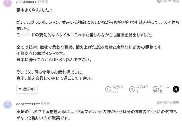 还有网友情绪激动,语无伦次,感谢张本全家,就差感谢祖宗了:“张本打得太好了!面对高茨、勒布伦、林诗栋这些实力强劲的对手,虽然打得很艰难,一度甚至到了极限边缘,但他咬牙坚持住了,干得真漂亮。面对莫雷加德那种特殊的打法,他也是在苦苦周旋中找到了获胜的机会。这一切都是精湛的技术、周密灵活的战术、千锤百炼的反应速度以及冷静判断力的成果。这是极具含金量的1500个积分。回国后请务必好好休息一下。还有张本的父亲、母亲,今年也辛苦了。请为儿子和女儿感到骄傲,幸福地生活吧!”
