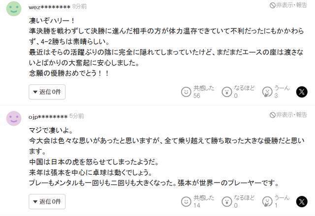 正是在日本媒体挑拨下,日本网友对张本智和总决赛的表现极为重视,看到他半决赛击败中国选手林诗栋,决赛在一场精彩对决中拿下莫雷加德,有球迷得意忘形道:“真的太厉害了。这次比赛想必经历了各种艰难,但全都克服了,最终夺得这个意义重大的冠军。中国球迷似乎把日本的猛虎惹怒了。明年,乒乓球界将以张本为核心而转动。无论是技术还是心态,他都成长了一大圈。张本就是世界第一的选手。”