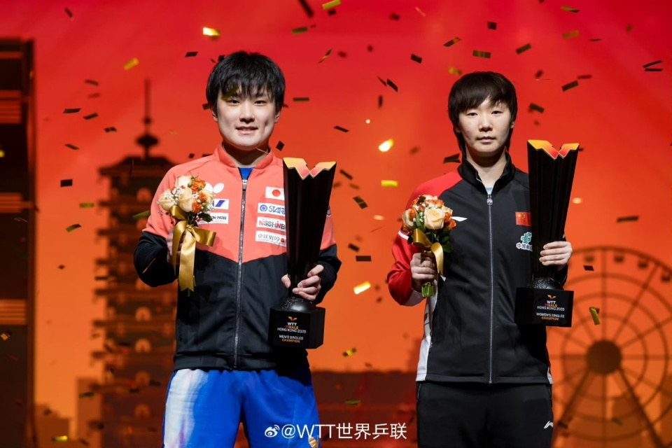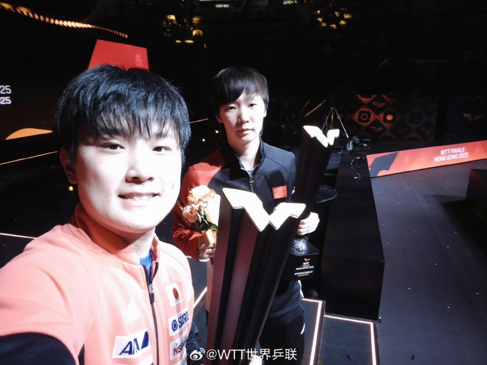 WTT香港总决赛结束,王曼昱和张本智和夺得女单冠军和男单冠军,颁奖仪式上进行了冠军合影。
