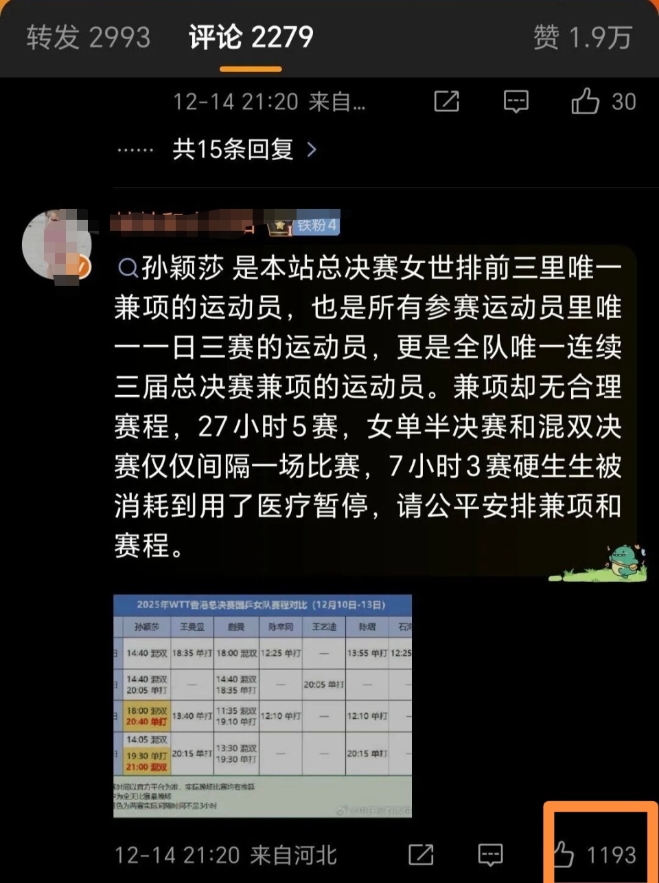 另外就在总决赛刚结束没多久,中国香港球员杜凯琹在表达对“莎头”二人受伤遗憾的同时,疑似批评WTT。