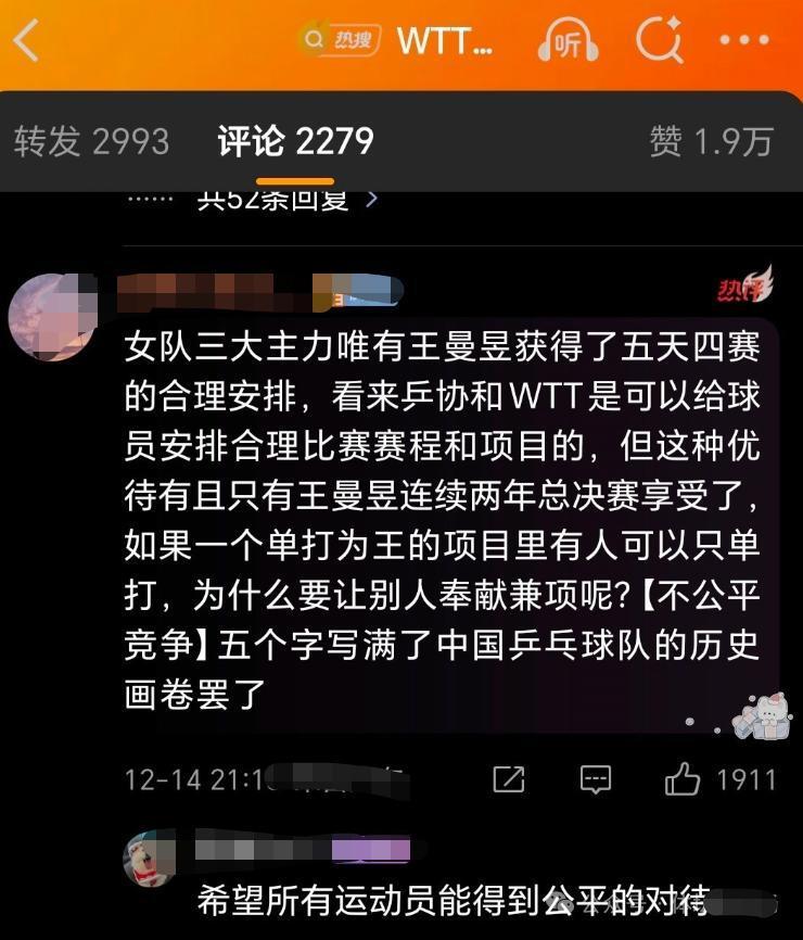 可以看到,已经很多国内球迷对于WTT的赛程密集表示质疑,却也有球迷指出另外的方面,也就是国乒对于王楚钦、孙颖莎“过度使用”的问题。