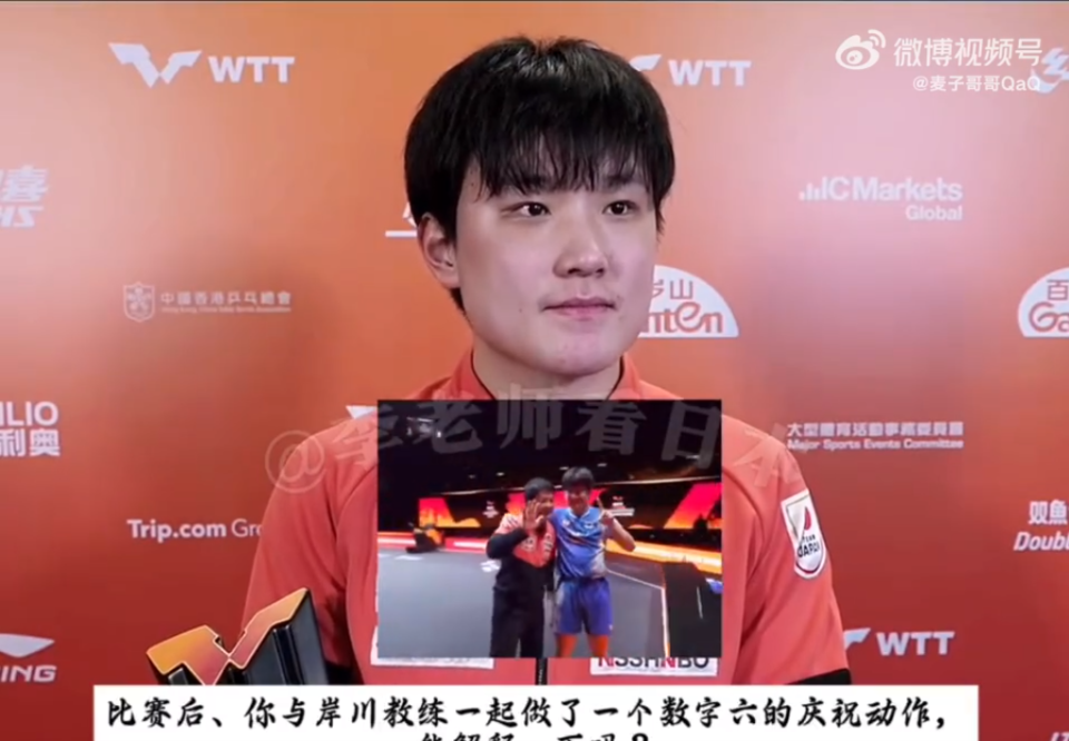 张本智和表示:“今天是岸川教练儿子6岁的生日,我昨天才知道这件事,心中倍感压力。即便赢了半决赛,如果决赛没赢,也构不成祝贺。半决赛结束之后我跟教练交流,如果决赛夺冠一定要做这个庆祝动作,能兑现承诺还是挺开心的,衷心表达了我的祝贺之情。”