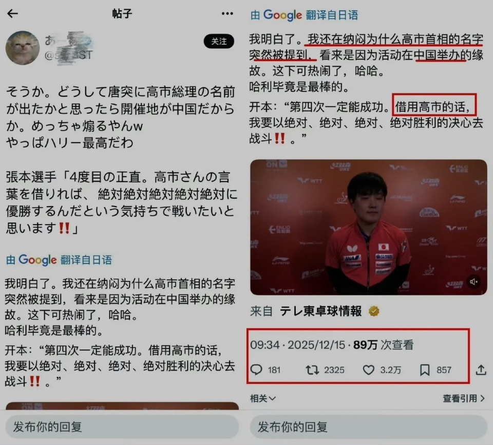 还有博主指出,张本智和引用的高市早苗语录,是高市在竞选成功后的宣言,这充分说明张本智和肯定关注日本国内的相关新闻,根本不是所谓“张本智和是体育生不知道高市早苗是干啥的”。