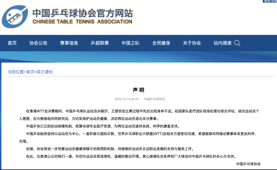 所以,在总决赛结束之后,中国乒协也是正式发声回应了孙颖莎和王楚钦先后因伤退赛这件事。中国乒协表示,孙颖莎和王楚钦的因伤退赛是经过了国家队医疗团队现场处理与综合评估,同时又结合运动员个人意愿,并在与教练组共同研究后的最终决定。