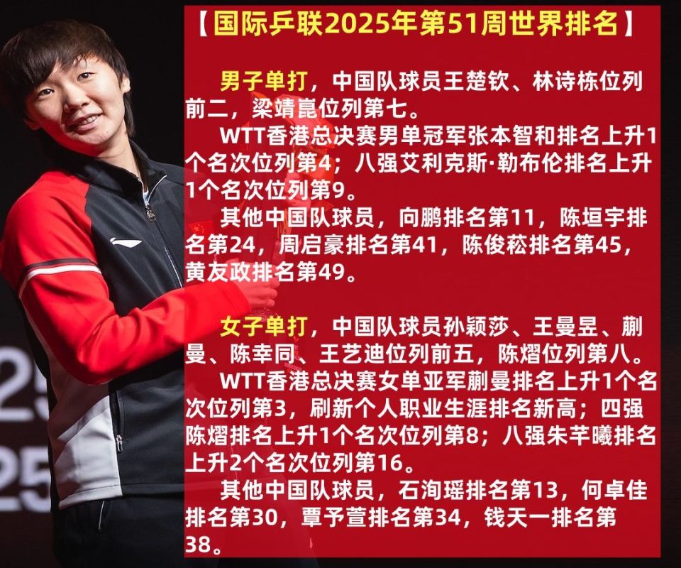 在经历2025年中国香港WTT总决赛令人惊叹的一周后,最新一期(第51周)国际乒联世界排名出炉,男女单打前十榜单出现关键变动。在TOP10中,国乒男单3人,女单6人。可见,男队统治力远不如女队。