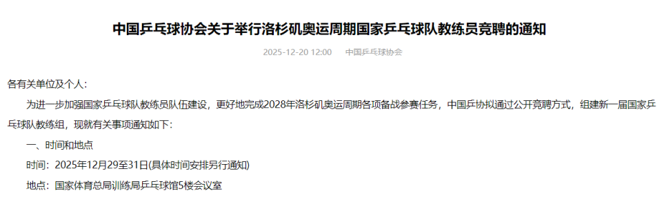 中国乒协官宣!将组建新一届国乒教练组:12月29日至31日公开竞聘