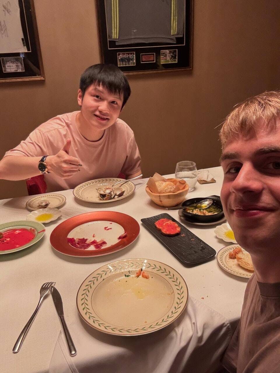 小胖在乒坛广结人缘,今年6月初加盟萨尔布吕肯时,即获巴黎奥运男单银牌得主莫雷加德接待,虽然二人前后脚加盟萨尔布吕肯,无缘成为队友,但莫雷加德离队前仍把握时间与樊振东聚会。