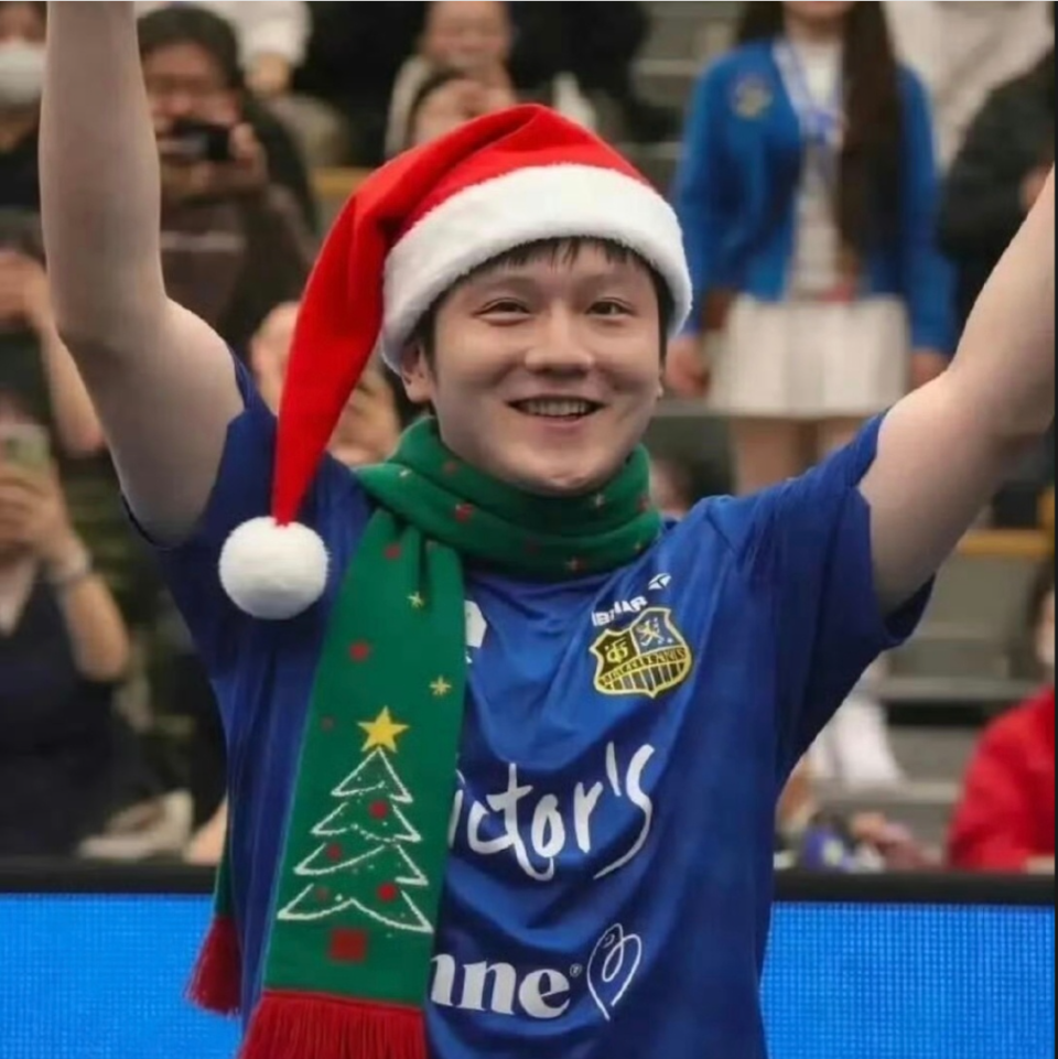 12月25日,樊振东发布和球员波尔的圣诞节合照,两人头戴着圣诞小红帽,笑嘻嘻地蹲坐在圣诞树前,画面格外温暖。