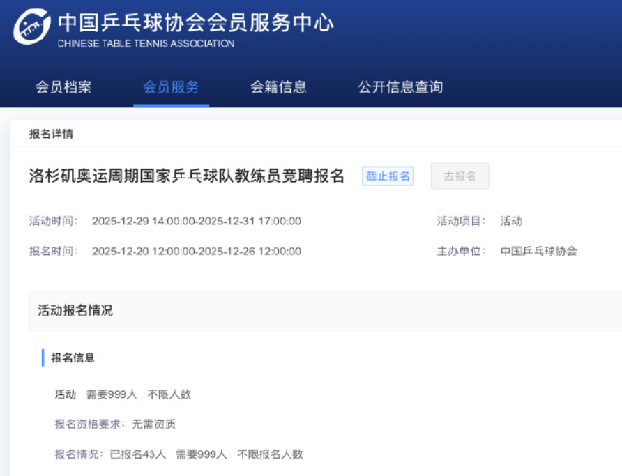 国乒2025年教练员竞聘工作已经拉开帷幕,根据中国乒协官网显示,北京时间12月26日中午12:00已经停止报名,现有43人竞争28个教练职位,那就意味着其中的15人将落选,由于无法看到报名人员信息,所以目前不清楚谁参与了竞聘,现任谁去谁留、是否会有新人加入引发球迷关注!