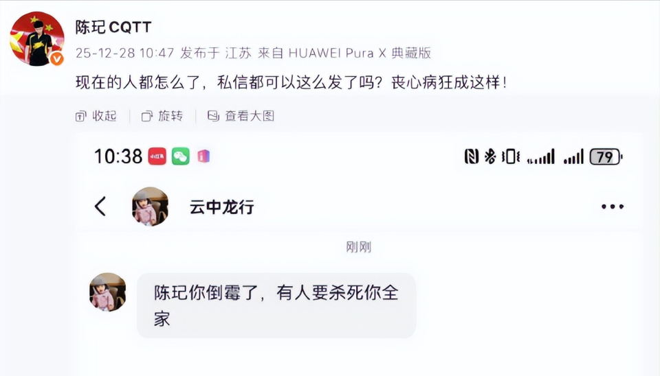 同时,陈玘配上了极端网友“云中龙行”的私信截图,内容包含死亡威胁内容,引发广泛关注。这位网友的IP属地在辽宁。