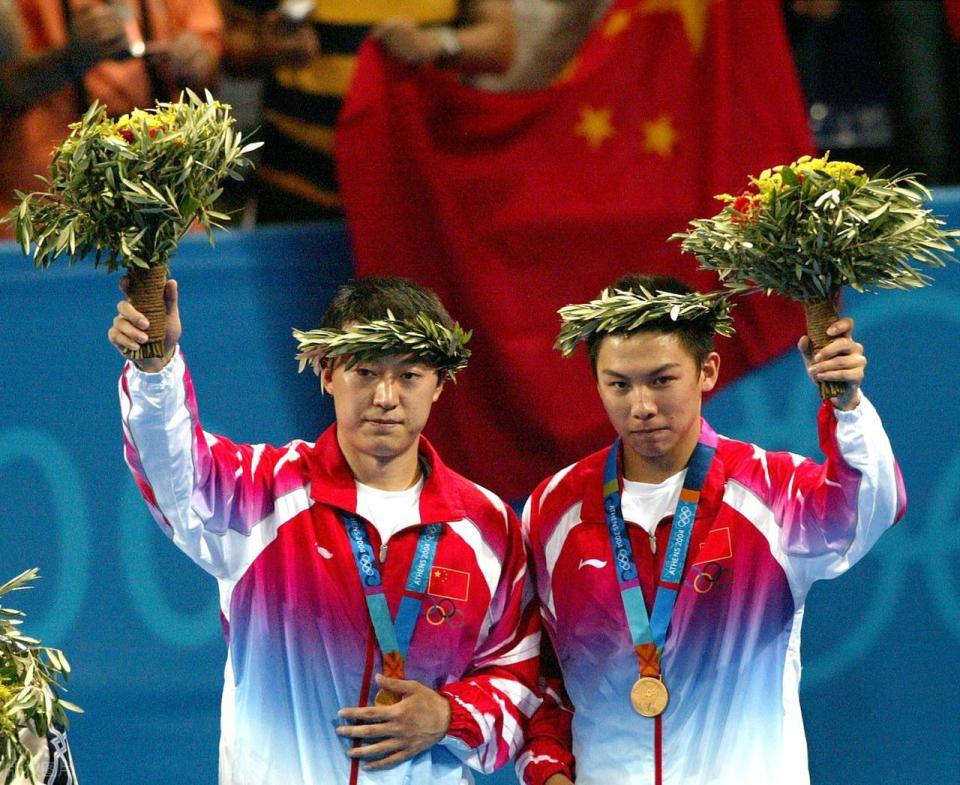 资料图:陈玘(右)、马琳夺得雅典奥运冠军
