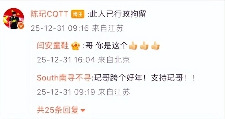 此前,2025年乒超总决赛在南京举行,作为东道主的陈玘与王楚钦、梁靖崑等国乒球员聚餐并合影。而12月28日,他晒出网友给自己的私信,上面写道:“陈玘你倒霉了,有人要杀死你全家。”