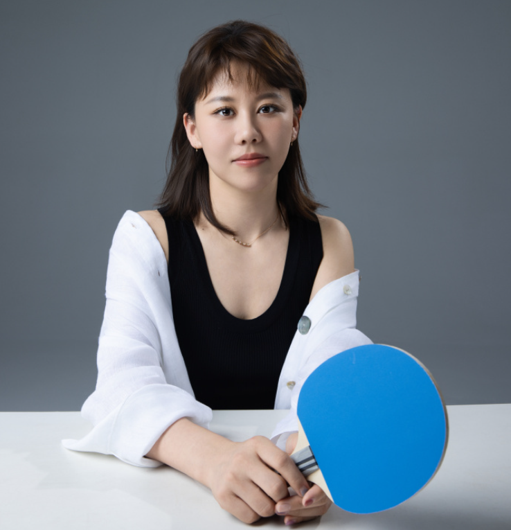 在下面这张图片中,陈幸同略施粉黛,长发披肩,露出了微微的笑容。她里面穿着无袖黑色连衣裙,外面套着一件白色的衬衣,露出了香肩,透着一丝性感。同同拿着一个蓝色胶皮的球拍,整体画面优美极了。