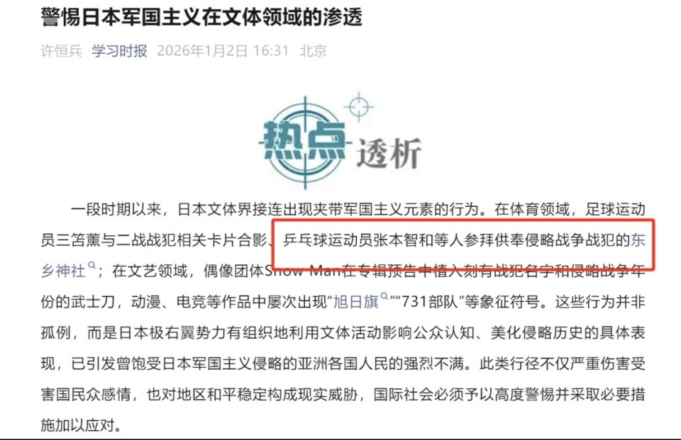 北京时间1月2日,权威媒体《学习时报》在第2版刊登了题为《警惕日本军国主义在文体领域的渗透》的署名文章,点名批评了日本球员三笘薰和日本乒乓球运动员张本智和。
