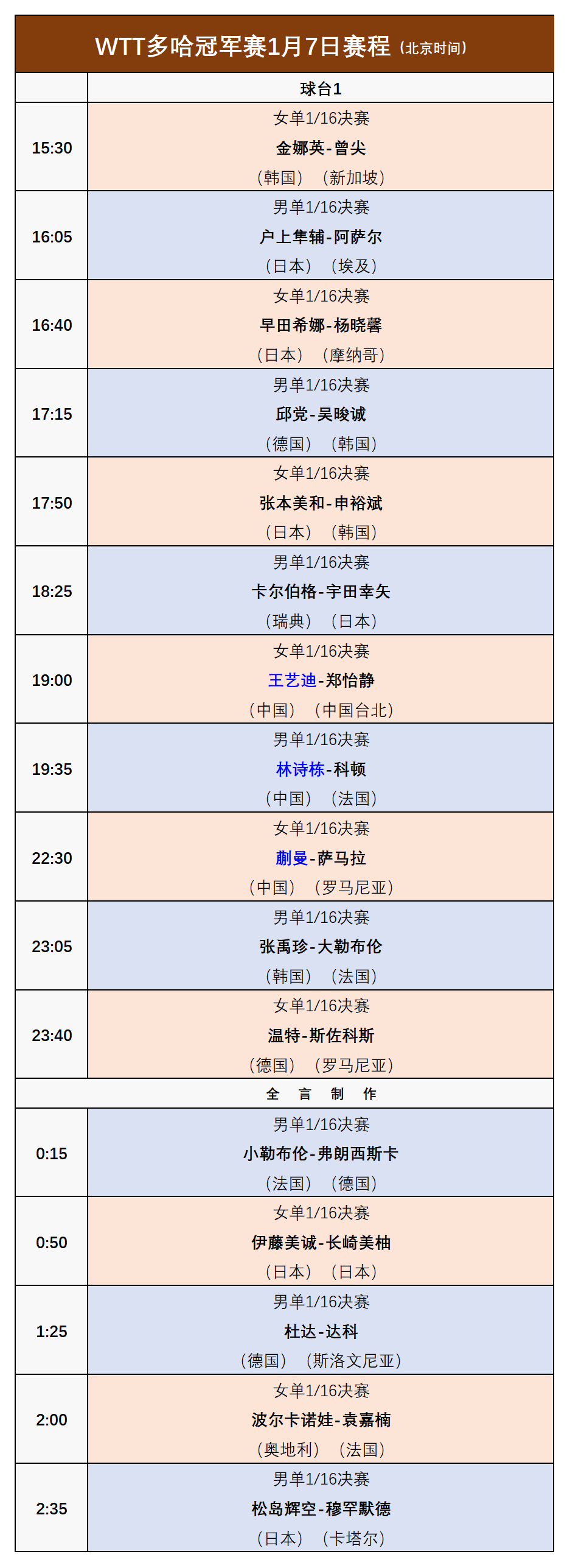 国乒新年首战今天开打!1月7日赛程公布:中国队3大主力登场