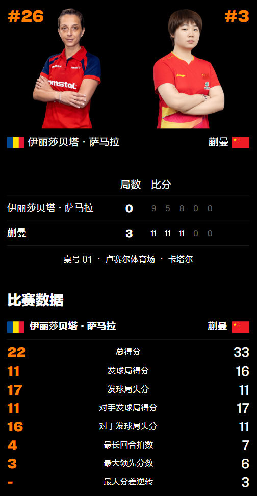 女单:蒯曼3-0萨马拉(罗马尼亚)、王艺迪3-0郑怡静(中国台北)。