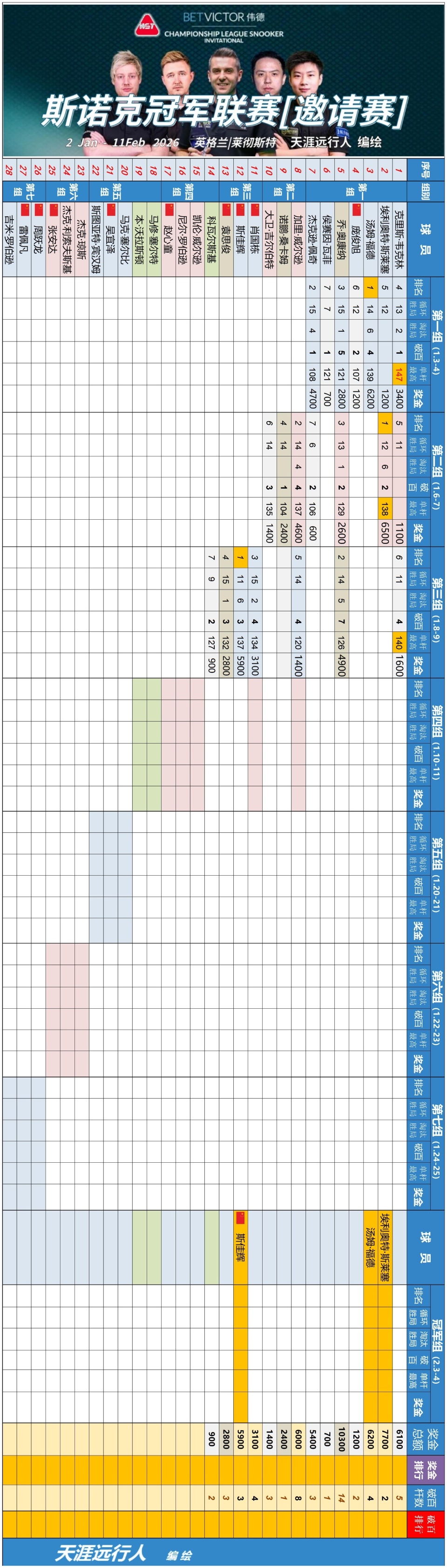 最新即时更新斯诺克冠军联赛邀请赛版进程签表,一表看冠军联赛争冠全程,敬请各位看官老师转发收藏,以备不时之需