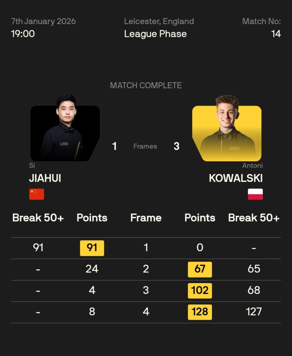 斯佳辉 1-3 安东尼·科瓦尔斯基